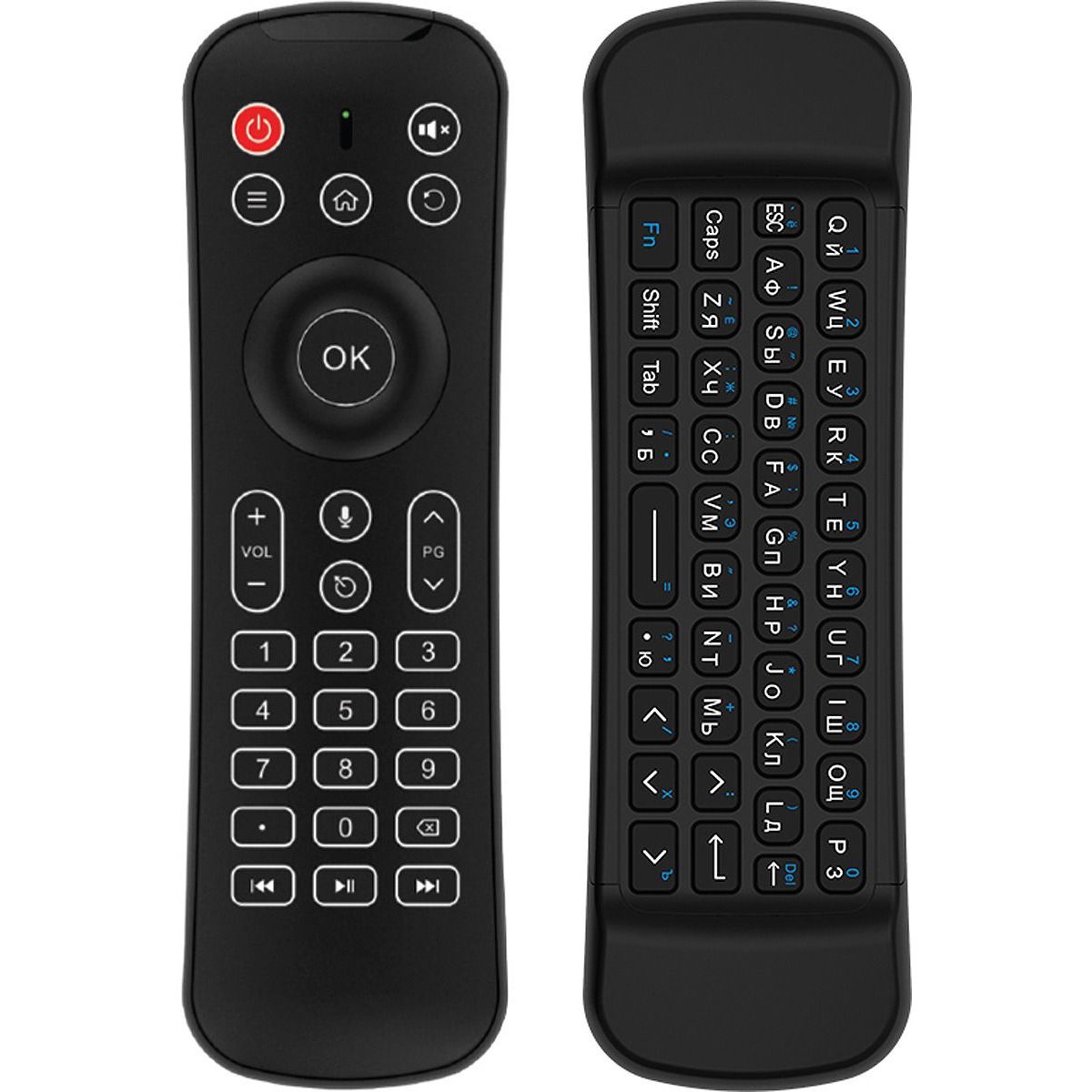Тип подключения беспроводной. Интерфейс: USB 2.0. Частотный диапазон 2,4 ГГц. Рабочее расстояние до 10 м. Встроенный гироскоп. Совместимость Smart TV / Windows /Mac OS / Android OS / Linux OS. Тип клавиатуры: компактная с русской и английской раскладкой.